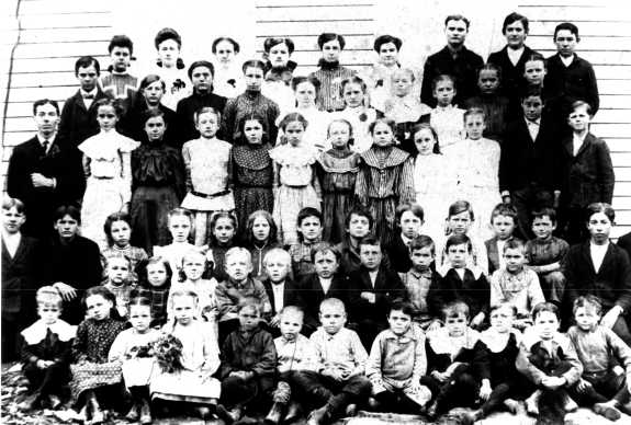 Fourth Row: Garfield Price (teacher), Emma Nelson, Ruth Creamer, Flossie Bell, Ada Bell, Anna Nelson, Mabel Parker, Elsie Creamer, Gertie Montague, Effie Terry, Virgil Creamer, and Ray Sauls.
